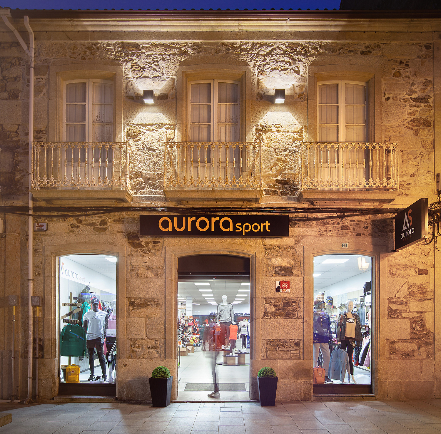Interiorismo de tienda de ropa y calzado deportivo. La tienda se ubica en un gran espacio diáfano, en el que se plantean los paneles de exposición del producto como una piel que forra los paramentos actuales, con paneles de madera-cemento, DM, chapas. Para ropa doblada, se plantean conjuntos de mesas a diferentes alturas, creando islas de exposición. En el suelo, hormigón pulido. Todo el conjunto persigue una imagen urbana, incluso dura, en el que se integra como único elemento con color, el volumen de baño adaptado a modo de container naranja.