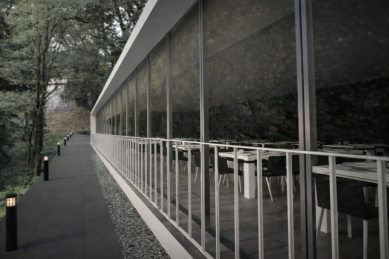 La parte acristalada está formada por puertas de vidrio replegables, de manera que el edificio pueda funcionar como un balcón totalmente abierto y en contacto con su entorno. Una terraza abierta como remate de la composición sirve como espacio complementario, que a su vez permitiría en el futuro una ampliación del espacio si fuera necesario.