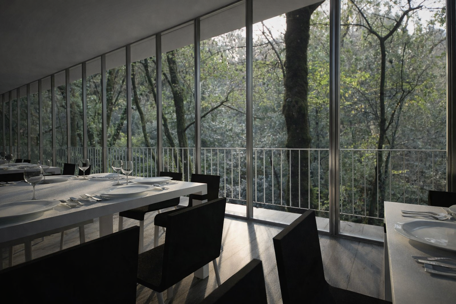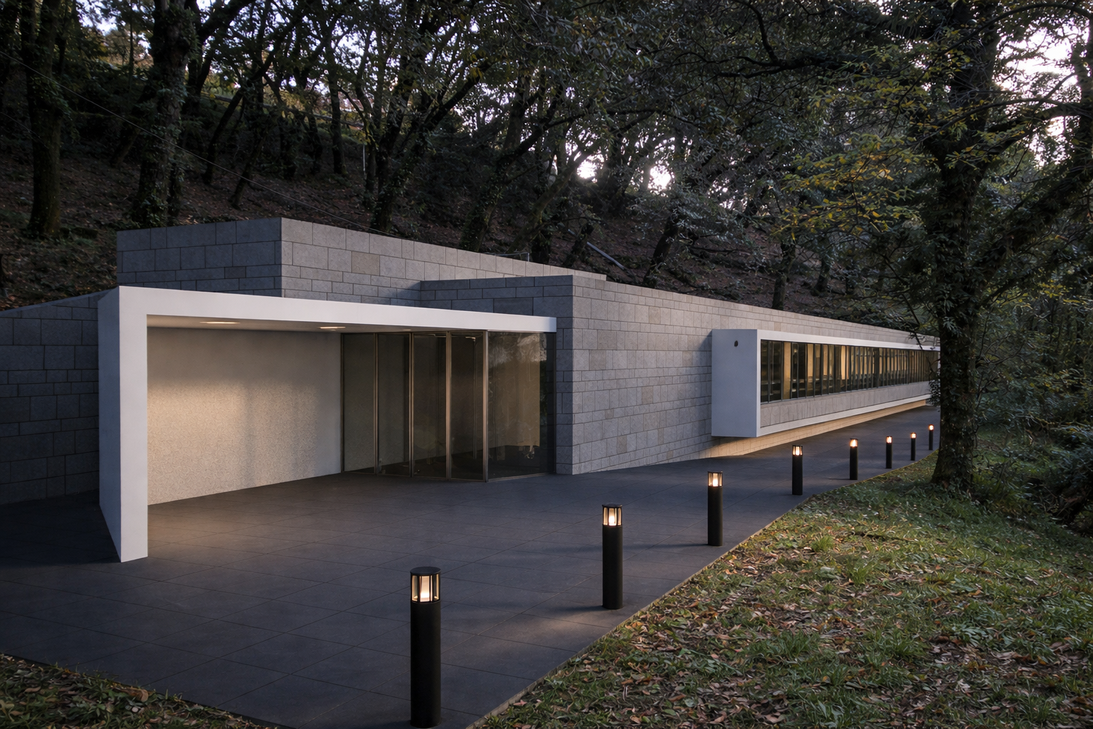 La idea del proyecto ha sido "encajar" el edificio en la ladera, de manera que se perciba como un "socalco", en la misma línea de los espacios anexos al Pazo. De esta manera se resuelve mendiante una cubierta ajardinada en continuidad con la pendiente del terreno y una fachada de piedra y vidrio volcada hacia el río.